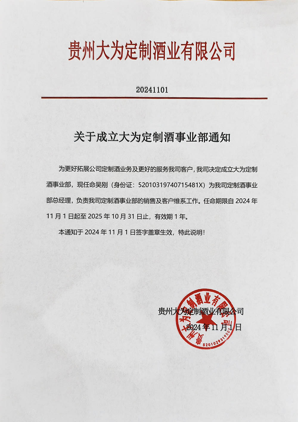 为更好的服务定制客户,公司决定成立定制酒事业部。任命吴刚同志为公司公司定制酒事业总经理。特此通知