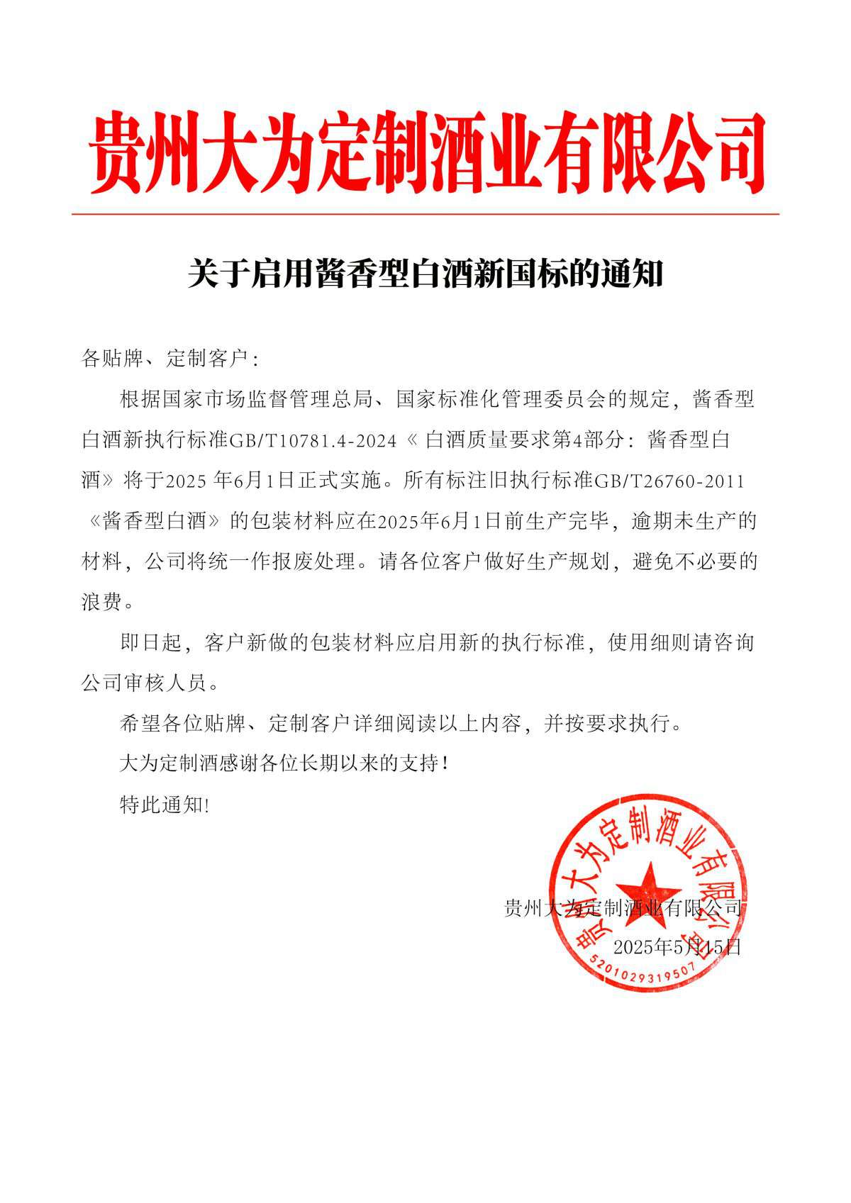 关于启用酱香新国标的通知