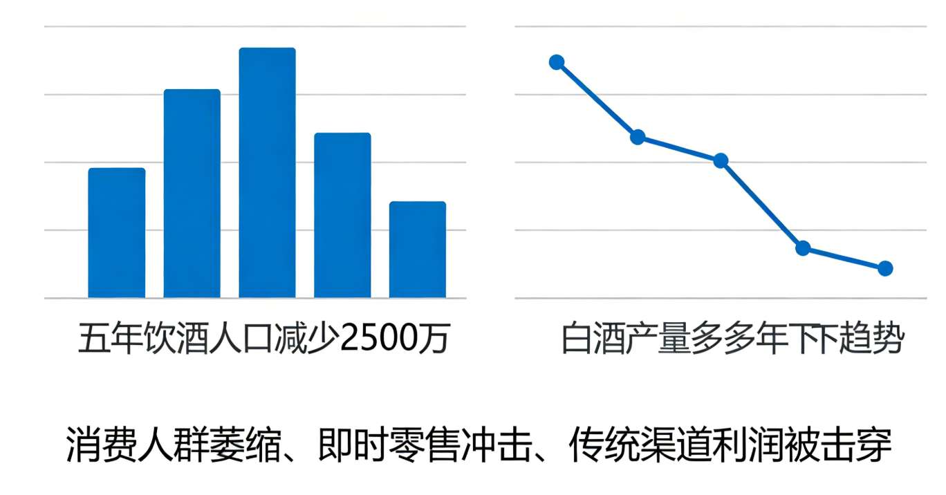 历经数十年高速增长后,国内白酒行业正式告别增量时代,步入前所未有的结构性深度调整期。最新行业权威数据显示,国内核心饮酒人口较五年前锐减约2500万,消费基盘持续收缩;与此同时,即时零售模式狂飙突进,彻底颠覆传统白酒流通渠道,以“层层分销、囤货压货、渠道为王”为核心的传统商业模式,正遭遇前所未有的生存挑战。